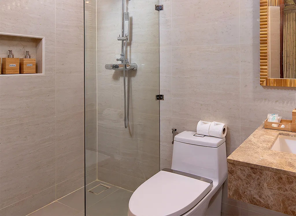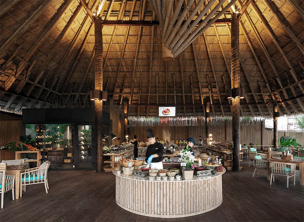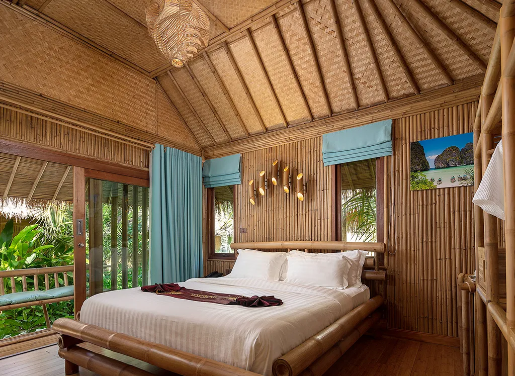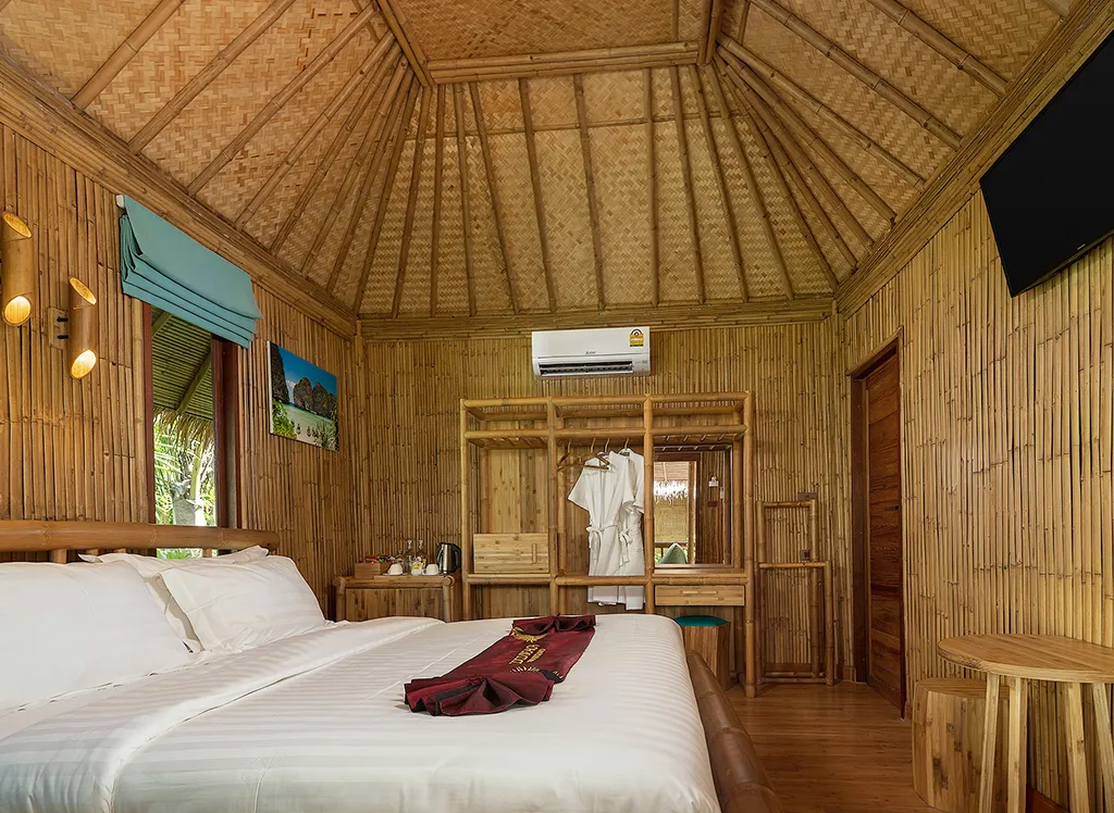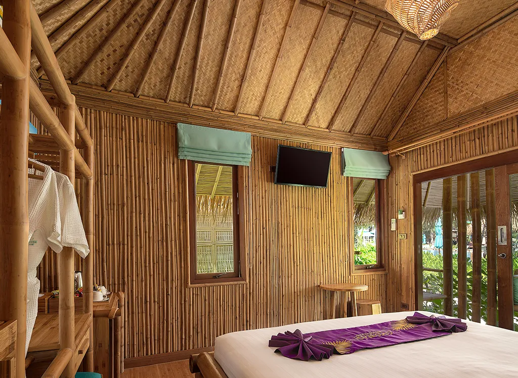 På Phi Phi CoCo Beach Resort, som ble bygget i 2018, bor du i en fin bambusbungalow med stråtak med dobbeltseng eller enkeltsenger, garderobeskap og fint bad med dusj. minibar, safe, TV og klimaanlegg. Alle bungalowene har også en vakker terrasse eller balkong med utsikt over den frodige hagen. Det er mulig å oppgradere til havutsikt.