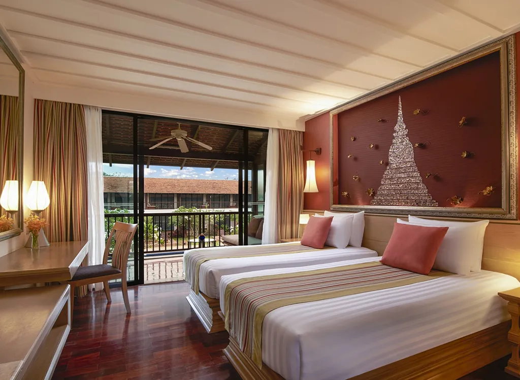 Alle rommene på Sukhothai Heritage Resort er romslige og pent innredet med komfortable senger, eget bad og en balkong hvor du kan nyte utsikten over den frodige hagen eller svømmebassenget. Rommene har også TV og Wi-Fi.