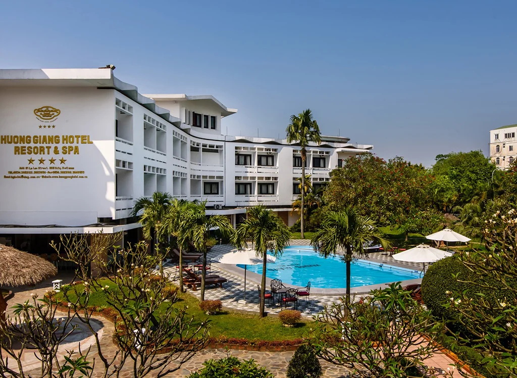 Hotellet byr blant annet på et herlig basseng, spaavdeling med mulighet for massasje og badstue, treningsfasiliteter, en gavebutikk og en koselig sky bar med en fantastisk utsikt over Hue.